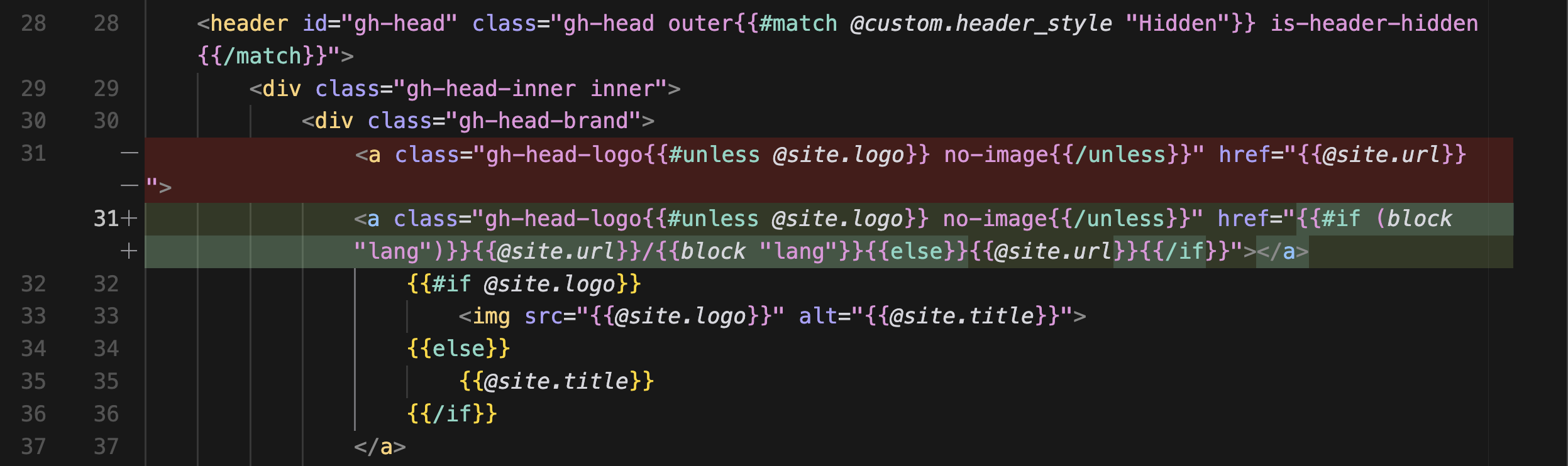 <a class="gh-head-logo{{#unless @site.logo}} no-image{{/unless}}" href="{{#if (block "lang")}}{{@site.url}}/{{block "lang"}}{{else}}{{@site.url}}{{/if}}">default.hbs에서 기존에 사용하던 방식처럼 block "lang"을 if문 조건으로 활용해서 처리하면 정상적으로 작동한다.